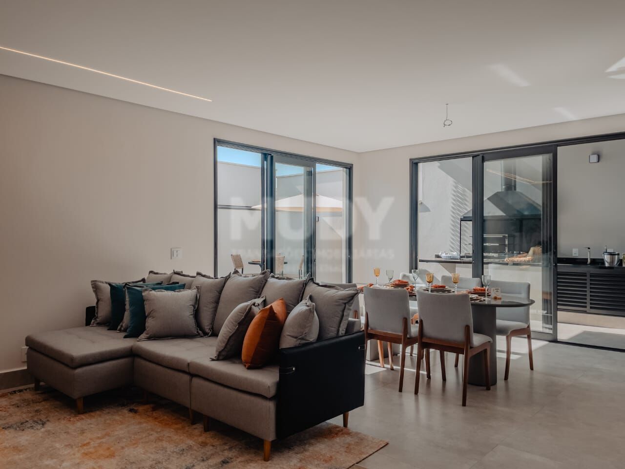 - Cozinha integrada à ampla sala de estar e jantar